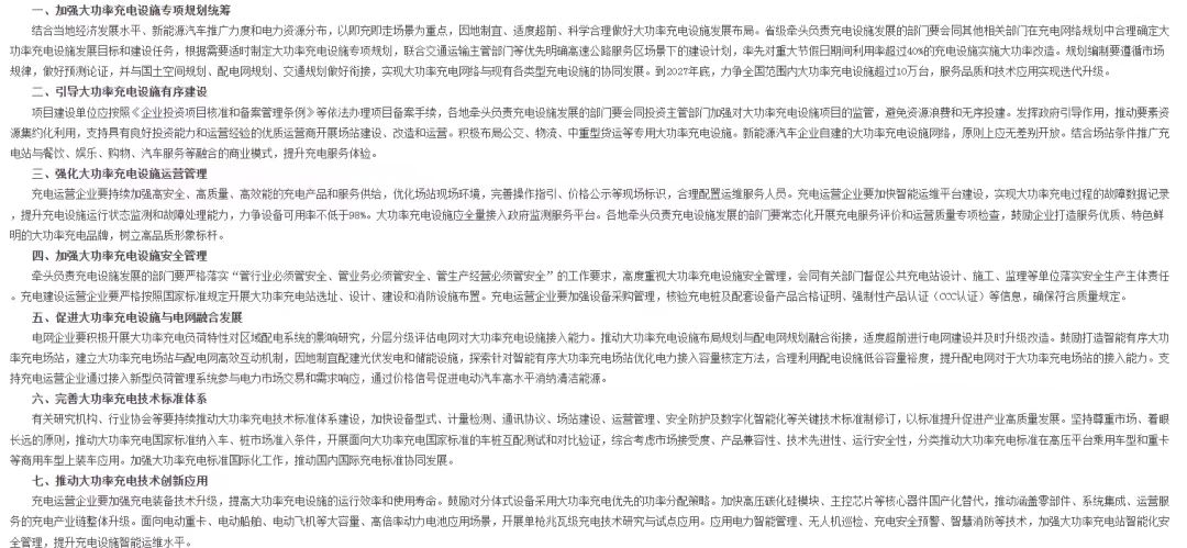 加强专项规划统筹:结合当地情况,以即充即走场景为重点做好布局。省级部门要确定发展目标和任务,可制定专项规划,优先明确高速公路服务区建设计划,对利用率超 40% 的设施实施大功率改造。到 2027 年底,力争全国大功率充电设施超 10 万台。